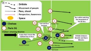 Paris Saint-Germain attacks into the attacking third.⑤Marquinhos received a pass from the left side and passed it to ②Hakimi on the right side.When Hakimi receives the ball, ㉔Spence moves towards him defensively.