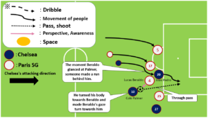 ㉓Chalobah on the back line received a back pass and made a sharp vertical pass to ⑩Palmer, who came to retrieve the pass between the opposing lines, and Palmer made a quick turn to face forward.Palmer’s forward movement between the opposing lines served as a catalyst for Chelsea’s vertical attack, and ⑳Joao Pedro at the front, also ran towards Paris Saint-Germain’s goal.