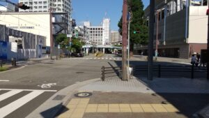 交差点の奥にはJR川西池田駅のプラットフォームが見えます。