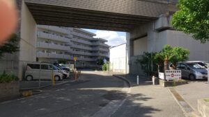 阪急宝塚線の高架を潜り、後ろを振り向きます。